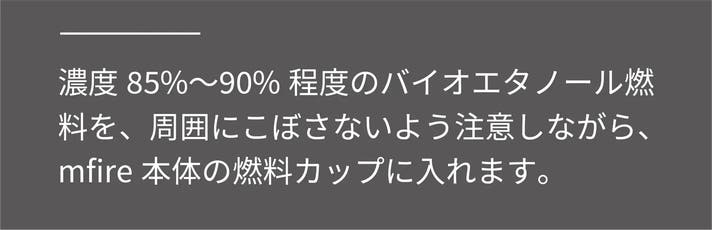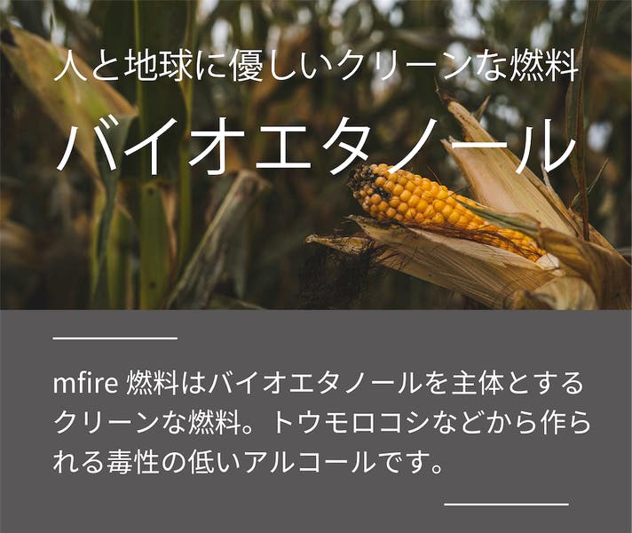 A.mfire専用燃料をお使いいただくことができます。また、専用燃料の他に市販されているバイオエタノール燃料(濃度85%以上のもの)も、お使いいただくことができます。mfire専用燃料はmfire公式オンラインサイトでも後日販売予定ですので、必要な際にお買い求めいただけます。灯油や軽油、ガソリンなどその他の燃料で代用することは絶対におやめください。