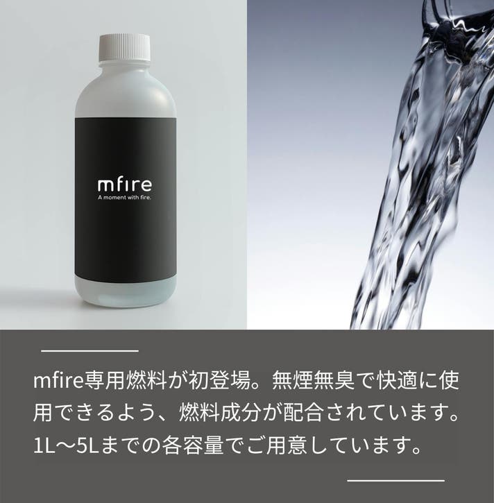 無煙無臭で快適にmfireを使用できるよう配合されています。1L、2L、5Lの容量でそれぞれ用意しております。