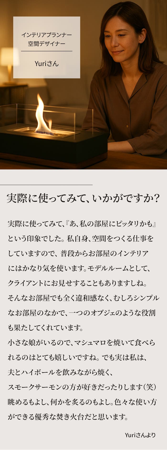 自然に出かけに行くほどの時間がない中でも、また様々な準備をしなくとも、炎のゆらめく時間を楽しむことができます。