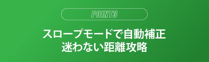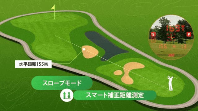 高低差を含めた距離を自動で補正し、打つべき距離を瞬時に表示するのがスロープモードです。これにより、複雑な計算を自分で行う必要がなくなり、番手選択の精度が一段と高まります。