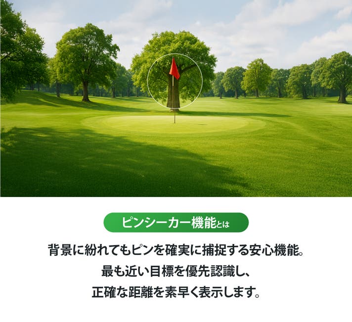 A. 背景の木や障害物に紛れても、最も近いピンを優先的に捉え、ロックオンした瞬間に振動でお知らせします。確実な距離把握をサポートします。