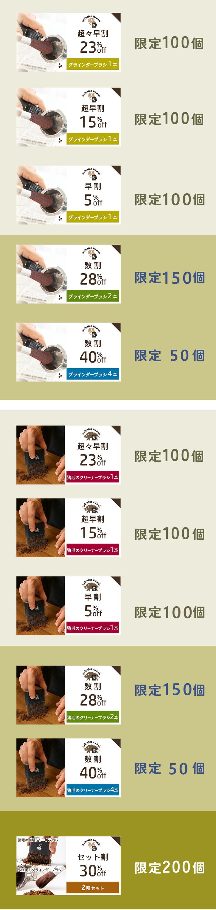 リターンはグラインダーブラシ、カウンターブラシの単品とセットのリターンも用意しています。