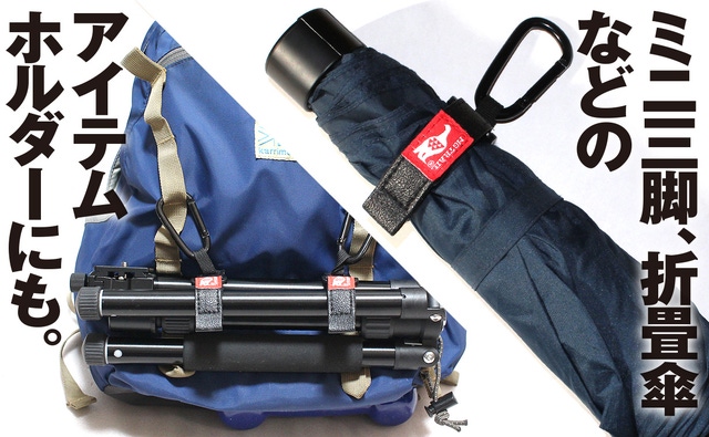 - 滑り止めベルトで折り畳み傘、ミニ三脚、クッカーなどを掛けられてキャンプアウトドアでも活躍します