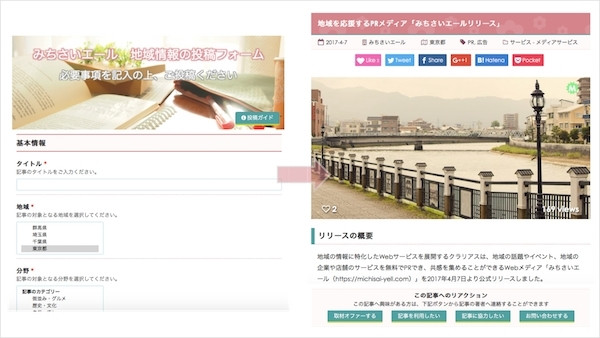 PRの記事はWeb上で簡単に作成することができ、公開された記事には各種SNSのシェアボタンの他にも、記事に関心ある方からの連絡(取材や記事の利用に関するお問い合わせなど)を受け付けられる、リアクションボタンを選択して付けることができます。