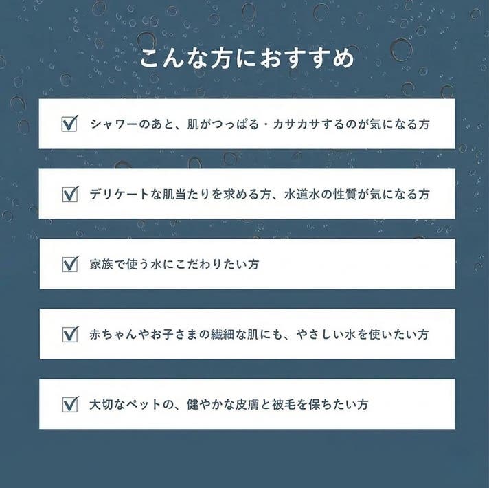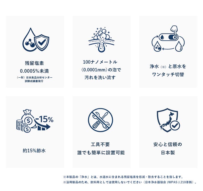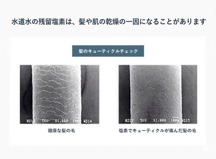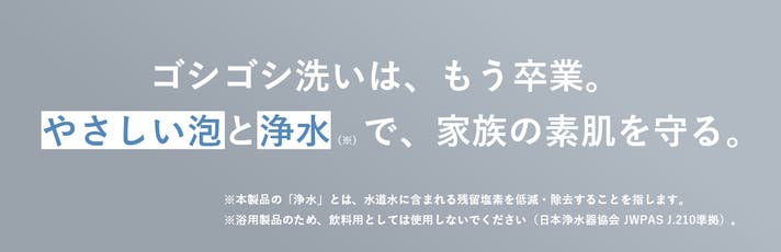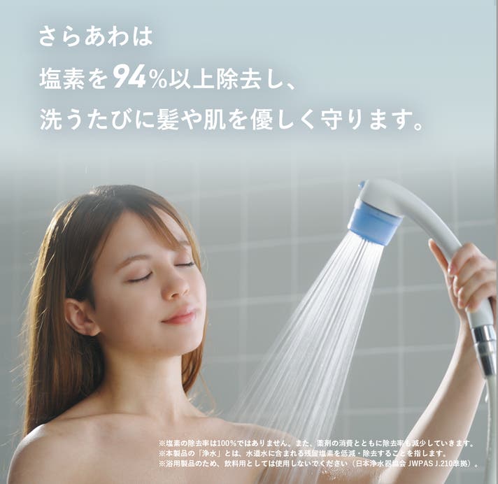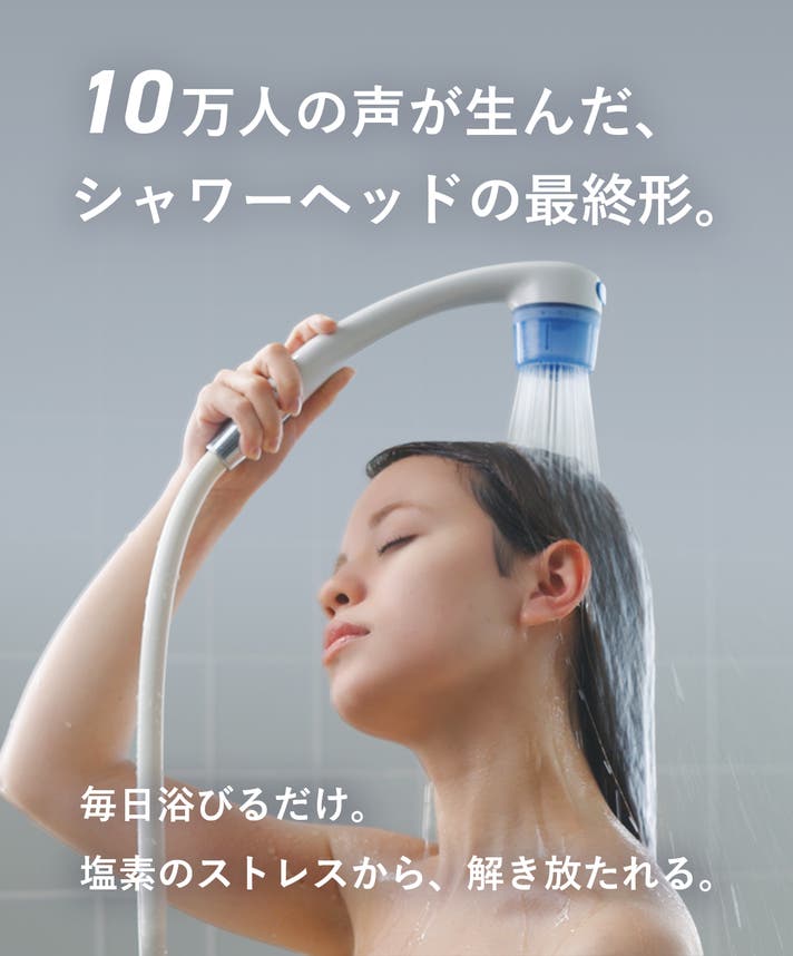 - 毎日浴びるだけで、塩素のストレスから解放。触りたくなるツヤ髪と、家族の笑顔を守る。