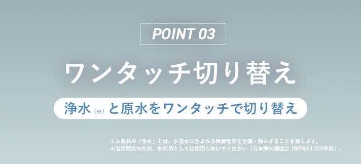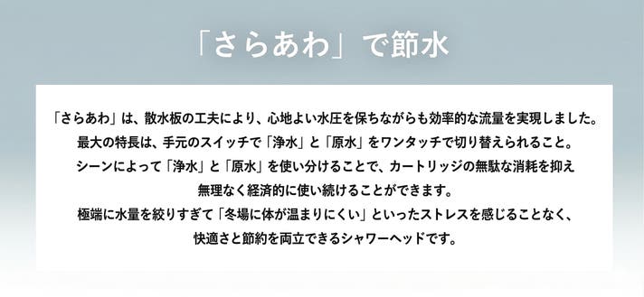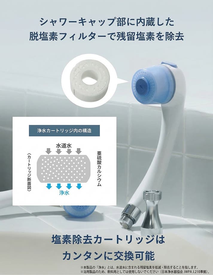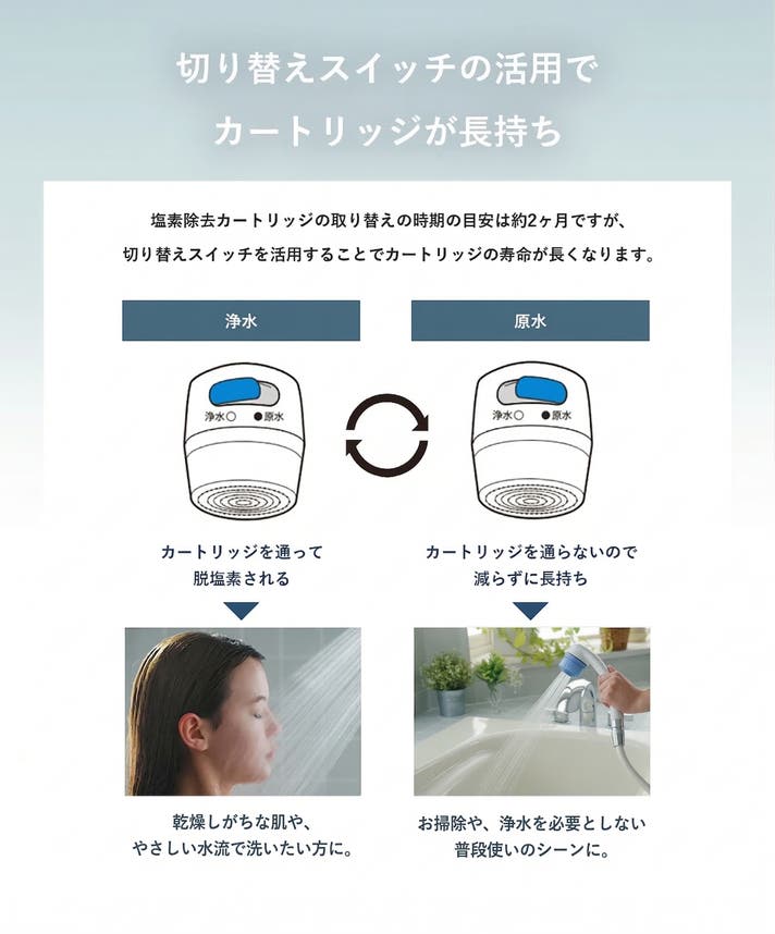 - 塩素除去とマイクロナノバブルを一体化。切り替え機能でカートリッジ長持ち。