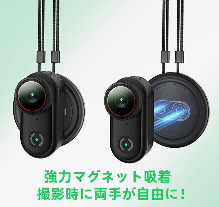 首に掛けて使用するトラップで、磁石でカメラを吸着固定することで、胸元からの視点撮影や手放しでの日常撮影に便利です。