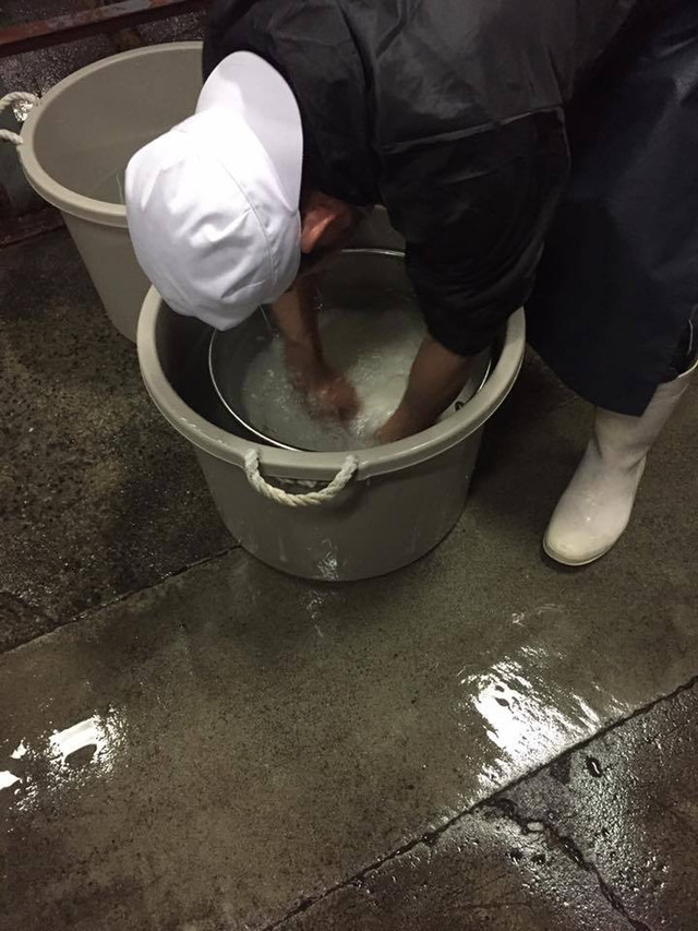 <米洗い>極寒の寒さの中限定給水の為、素手による米の手洗い