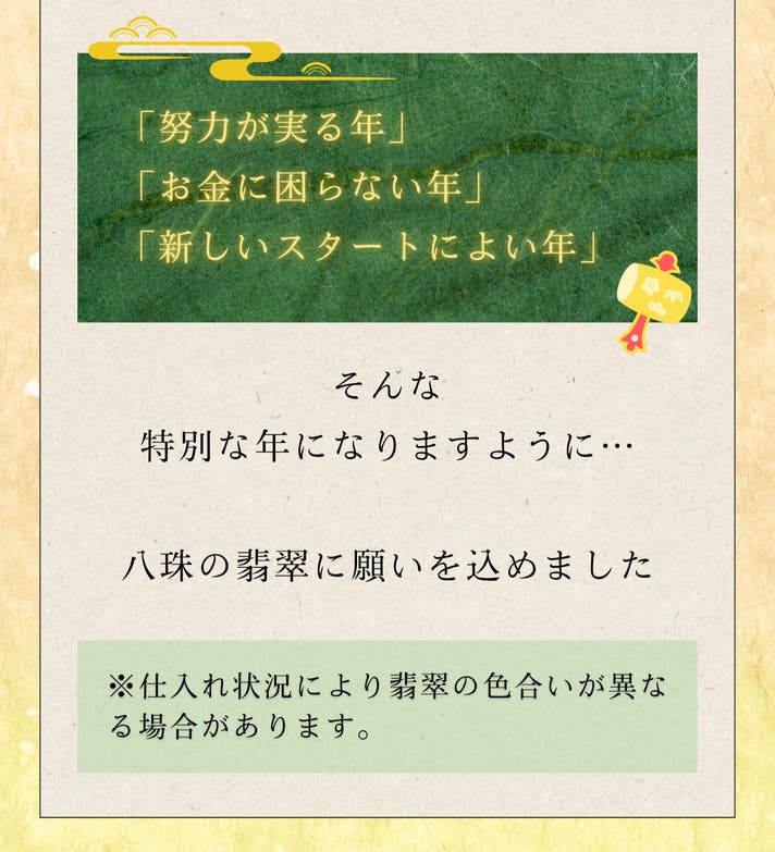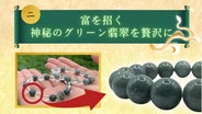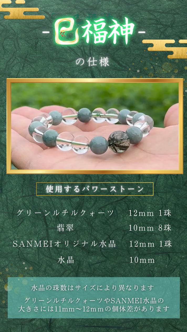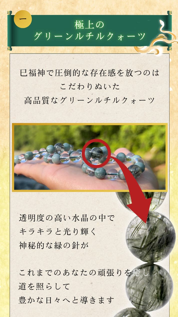 - “福を導く”極上のグリーンルチルクォーツと、古より奇跡の石とされる“富を招く”8珠の翡翠を使用