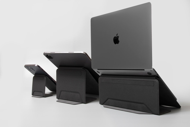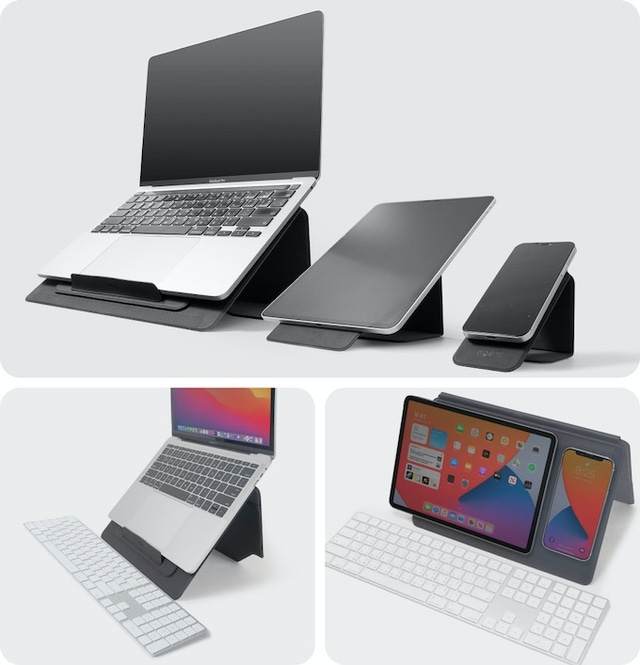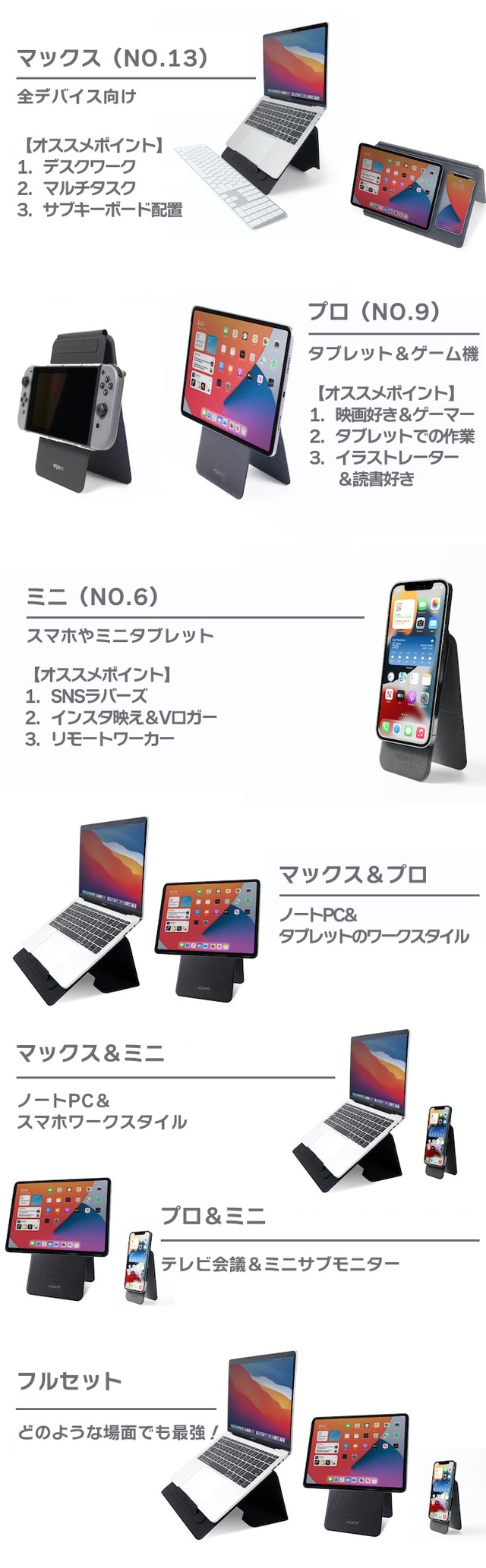 - スマホ、タブレット、ノートPC、ゲーム機などあらゆるモバイルデバイスの無段階角度調節をサポート