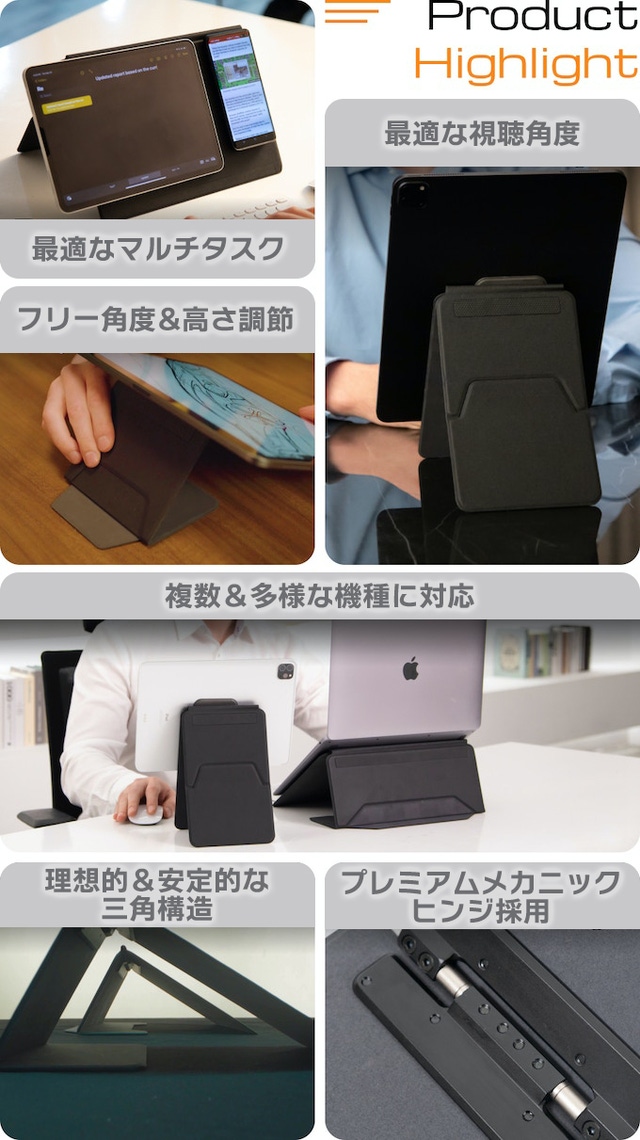 圧倒的な安定感&プレミアムヒンジによる自由な角度調整+複数のデバイスに対応する一品を探す旅はここで終了です。
