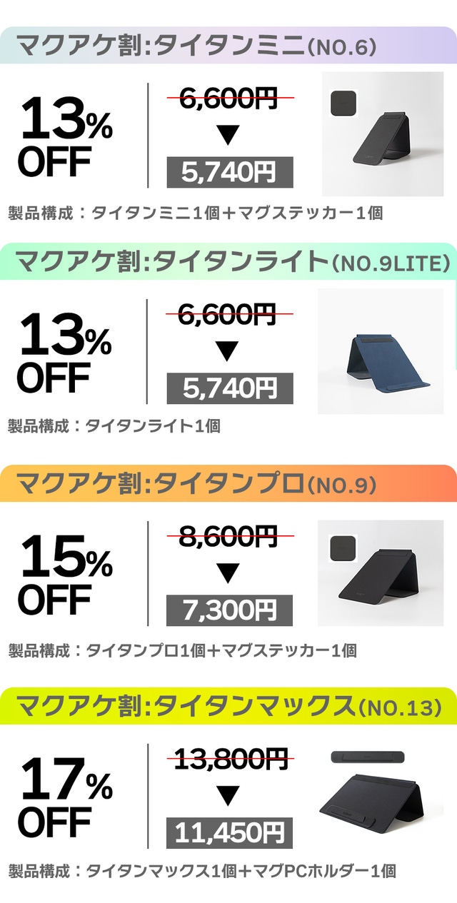 色んなデバイスをお持ちでも大丈夫! MagStickerを貼り付けるだけでTitanに一秒簡単吸着。マグネットだからTitanに付着するデバイスの入れ替えもストレスフリー!