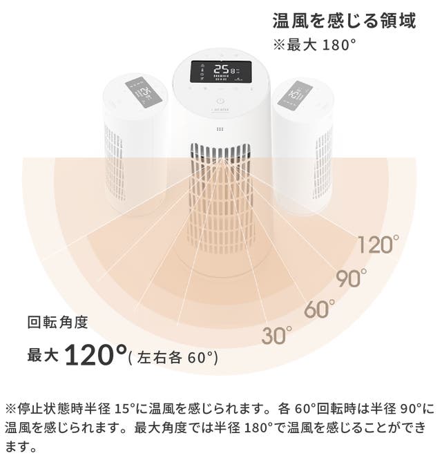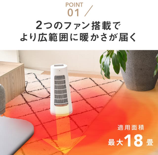 ファンを2つ内蔵しているため、自社従来品よりも「より遠くまで、暖かく」温風を届けます。