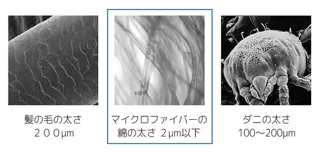 マイクロファイバー綿は名前のように「非常に小さな繊維」で構成されています。髪の毛の太さの1/100にすぎず、またダニの胴体の太さよりもはるかに薄く製織された繊維だからバクテリアや害虫が寄生しにくいのが特徴です。