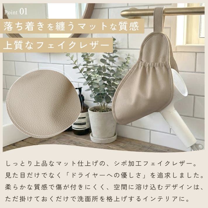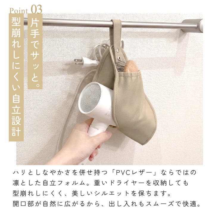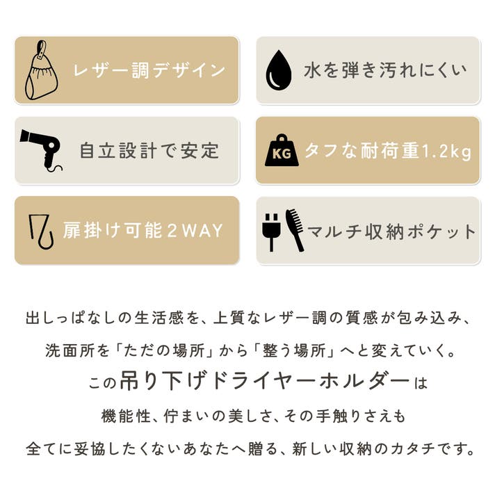 私たちは、毎日使う道具だからこそ、仕舞い込むのではなく、インテリアとして「魅せる」収納を追求しました。上質なレザー調の質感にこだわり、重いドライヤーを預けても凛と自立する強さを持たせています。