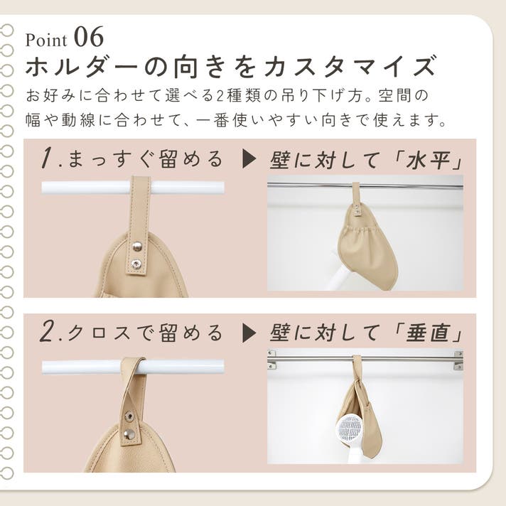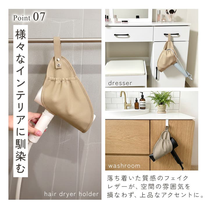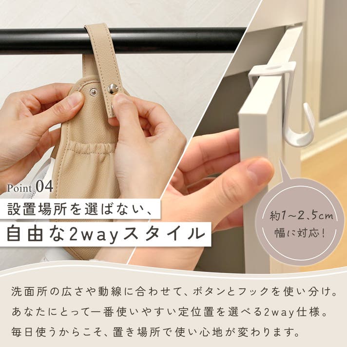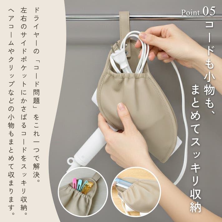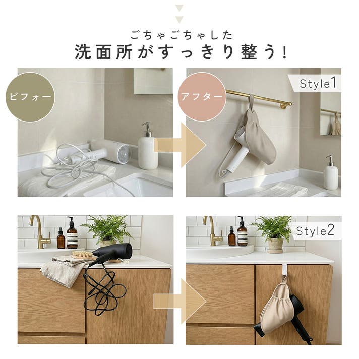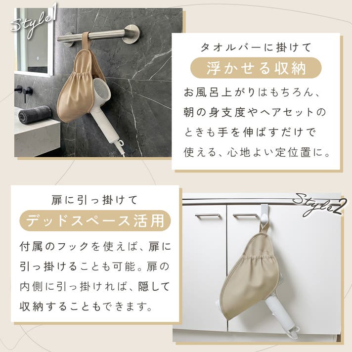 タオルバーに掛けるだけでなく、フックを使えば家中どこでも設置できる2WAY仕様。両サイドにポケット付きでコードまで丸ごと収まるから、視覚的なノイズも消え、まるでホテルのような洗練された空間が生まれます。