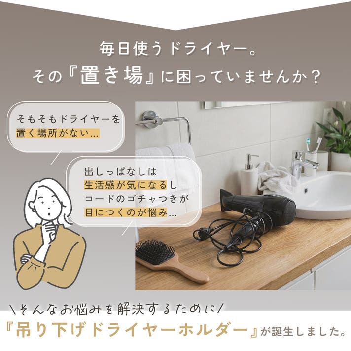 「掛けるだけで、整う」。この新しいドライヤー収納を、あなたの暮らしにお届けします。