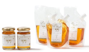 280gパック×3つ、140g瓶×2本、ミルクハニーを利用したスイーツの詰め合わせ。
