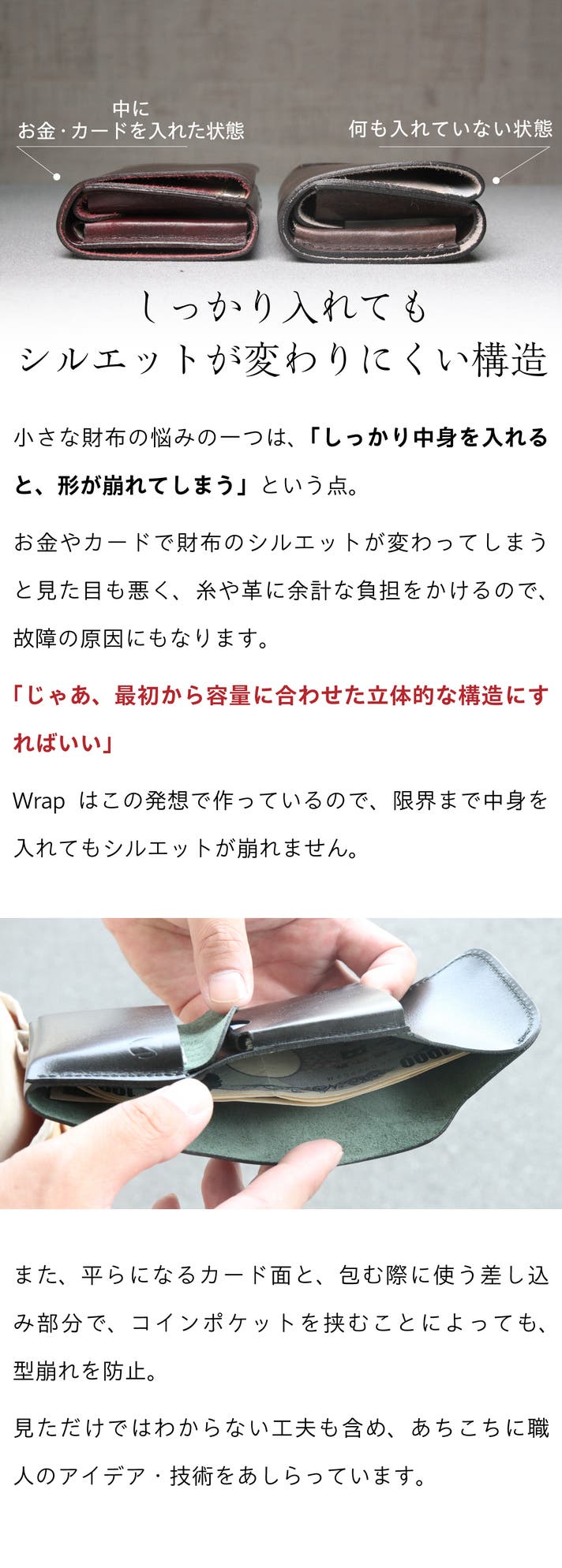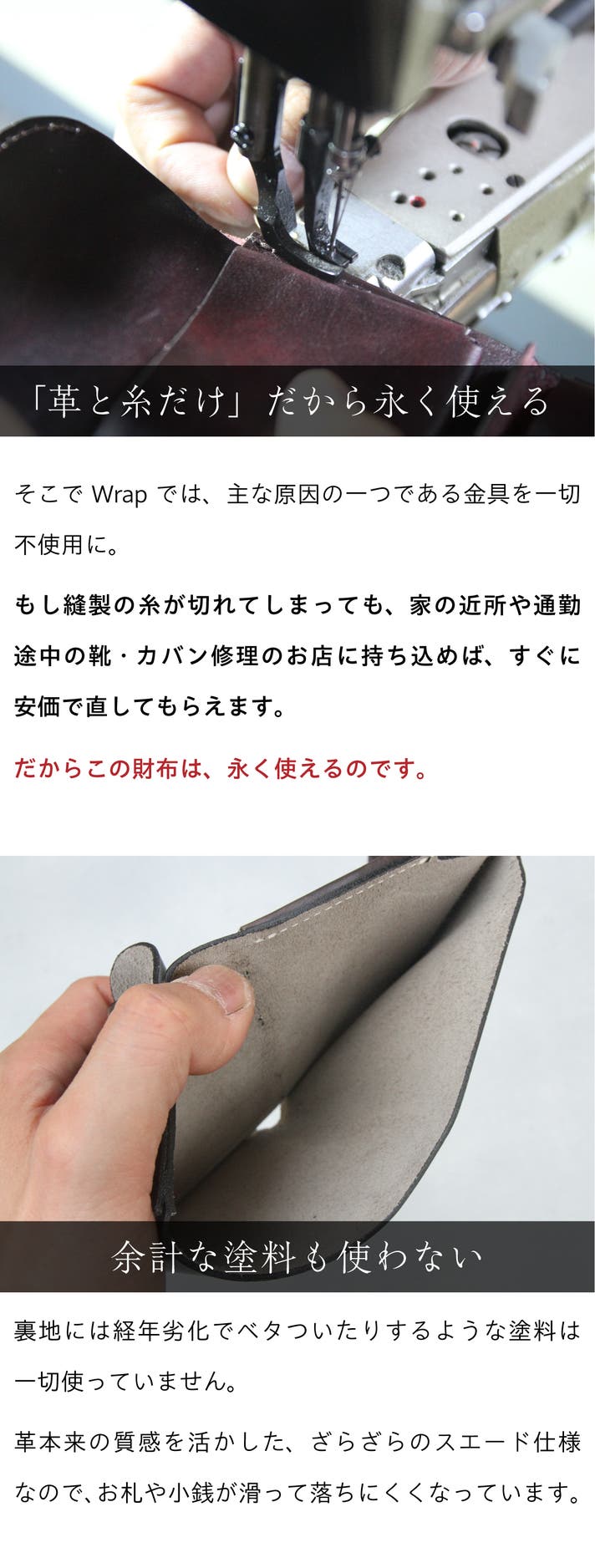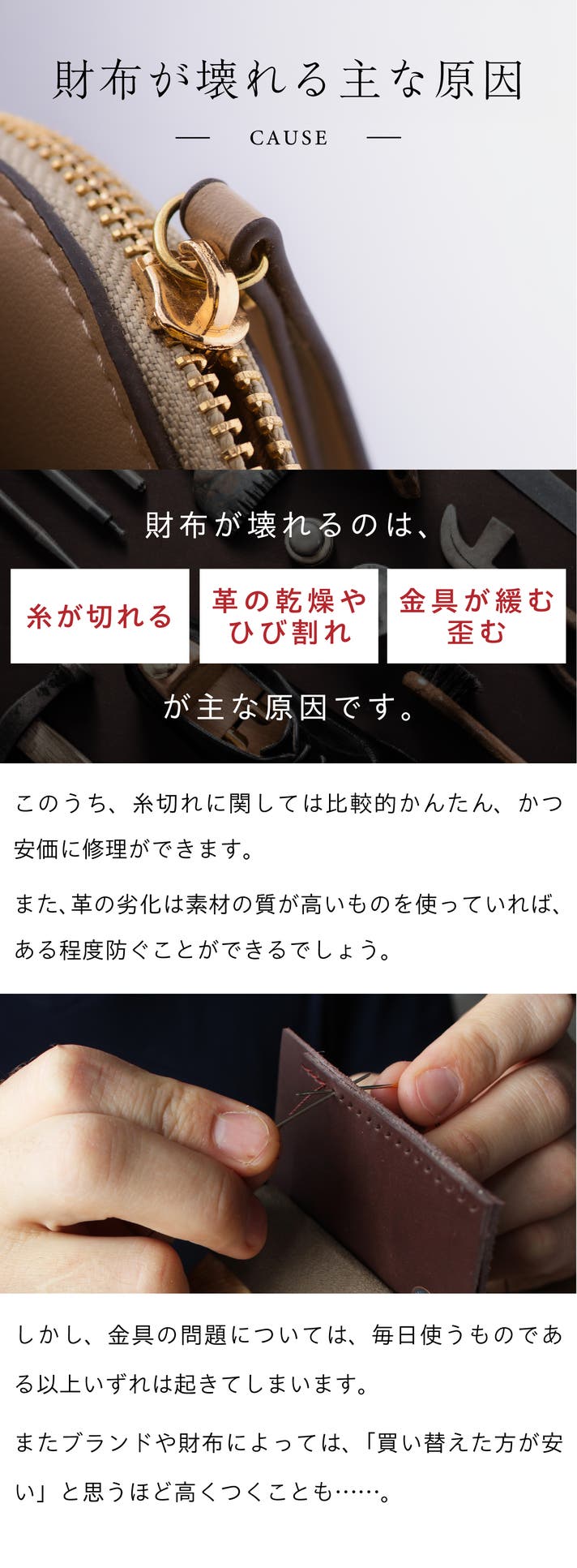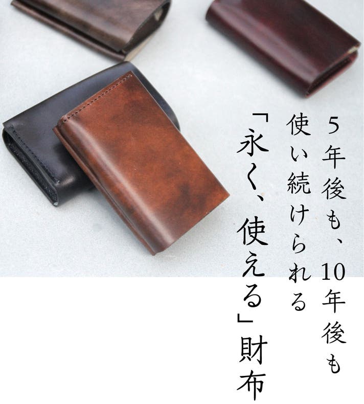 - 財布の故障原因の1つ「金具」一切不使用。“圧倒的に”壊れにくく、修理も簡単。だから永く使える。