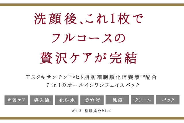 そのため、成分にもとことんこだわり、気になる年齢肌※4をケアする「アスタキサンチン※1」、「ヒト脂肪細胞順化培養液※2」などを配合。さらにリンゴ酸※3も配合することで、角質ケア・導入液・化粧水・美容液・乳液・クリーム・パックの1枚7役のスペシャルケアが叶う、実力派フェイスパックを開発することに成功しました。