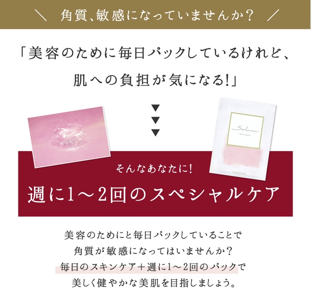 できるだけ肌への負担を軽減するために、「salmonスキンパック」には不要な成分を加えておりません。赤ちゃんの肌にも使用できるようなやさしさを目指して開発しました。敏感肌の方も気兼ねなくご利用いただけます。