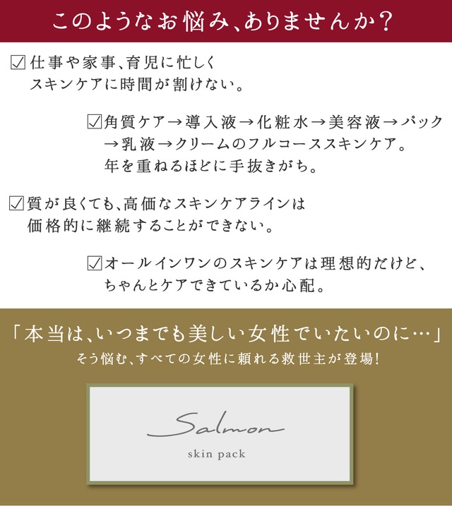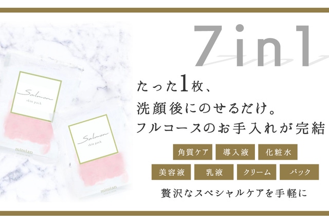今回はその第一弾として、<<週に1回>>洗顔後にたった1枚、シートマスクをのせるだけで、角質ケア・導入液・化粧水・美容液・乳液・クリーム・パックの7in1のスペシャルケアが叶う「salmonスキンパック」を開発。
