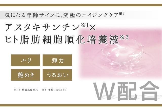 気になる年齢肌※4をケアする「アスタキサンチン※1」と保湿力に優れた「ヒト脂肪細胞順化培養液※2」を贅沢に配合。年齢を重ねるほどに気になる、肌のキメ、うるおい、弾力、肌荒れなど、女性が悩みがちな肌状態を健やかに整えます。
