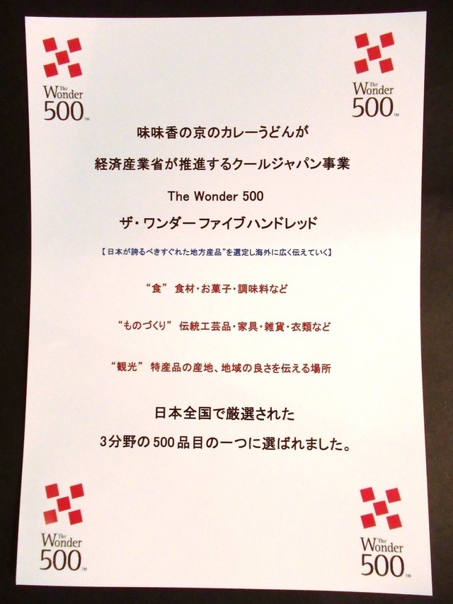 お帰りの際、経済産業省のクールジャパン事業“The Wonder 500”【日本が誇る優れた地方産品】に認定された味味香の京のカレーうどん即席麺2個。。※お土産の即席麺はご来店が必須となります。