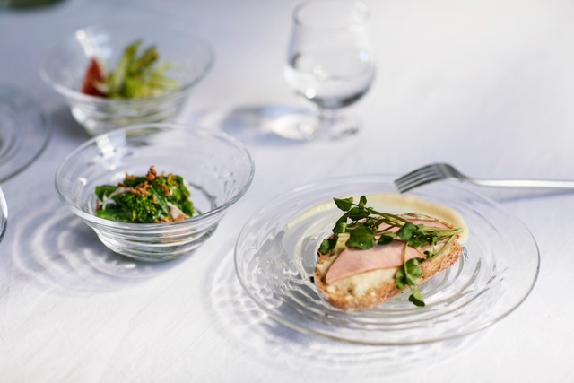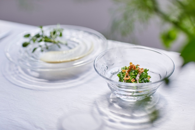 透明感が非常に高く、料理を盛り付けると水面に浮かぶような浮遊感のあるデザインです。特にstillは底部分に厚みを持たせることで光がしっかりと入って屈折し、料理を特別な一皿にしてくれます。眺めて美しく、料理を乗せて映える。オブジェとしてだけではなく、ARTと暮らしをつなぐ器です。お料理好き、器の方、プロのシェフからフードコーディネーターの方など、料理を景色として捉える方々と「器とお料理が一体になる美しさ」を一緒に生み出していければ最高に幸せです。