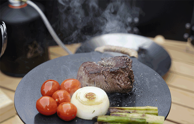 ・焦げ付きにくく、どんどん焼ける!! 食材を焼いても焦げ付きにくいグリドルは、色々な料理を作る楽しみがあります。 キャンプご飯の代名詞であるステーキや、焼きそば、アヒージョなどお好みの料理で使用できます。 調理が終わればそのままプレートとして使えるので、出来立て料理をすぐに味わえるのも魅力のひとつです。