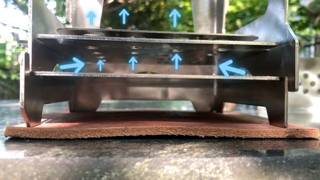 mini stoveは、二次燃焼に必要な、高温の空気を作り出すのに有効な二重構造になっています。(こちらの写真は、手前の内壁と外壁を取り外した状態です)