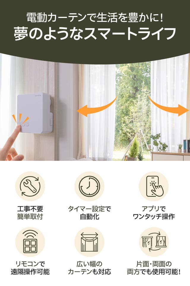 あなたのご自宅に元々あるカーテンに後付けするだけで、簡単で楽にスマートな生活を送ることができます。