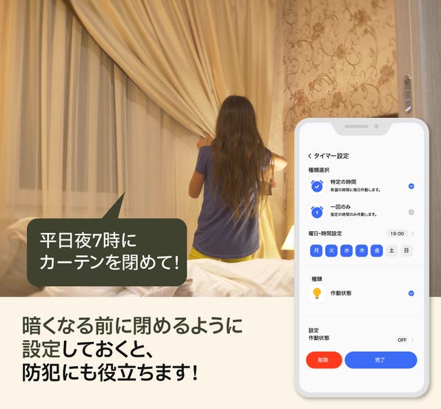 夕方に閉めるように設定して置くと、カーテンを閉め忘れる心配から解放されます。