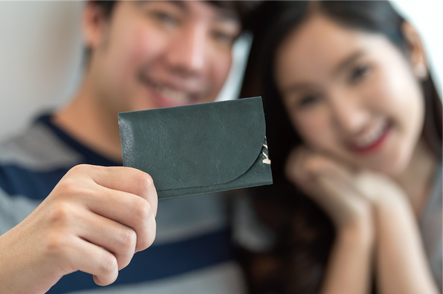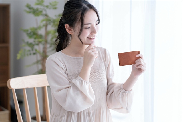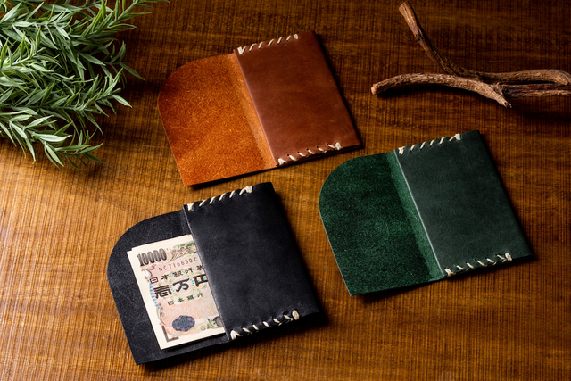 キャッシュレス化にともない、ウォレットも最低限必要なものだけを「すっきりコンパクトに」収めることを追求。入れたカードがベースになって、3つ折りにしたお札を挟むというシンプルな構造のデザインです。