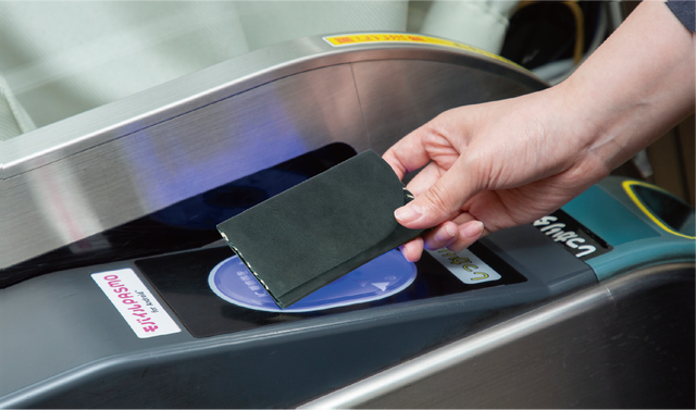 ▼ 交通系カードも【minim】に入れたまま改札をタッチ&スルー。自動販売機やコンビニでのカード支払いにも簡単に取り出せます。