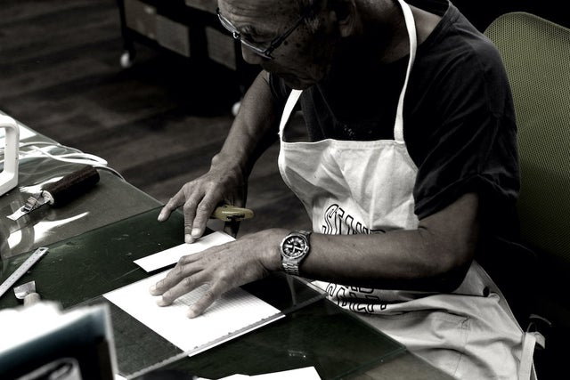 革の厚みを0.1mm単位で調整する漉き(すき)の技術によって、軽く薄くありながら十分な強度と耐久性を維持するという匠の技が生かされています。