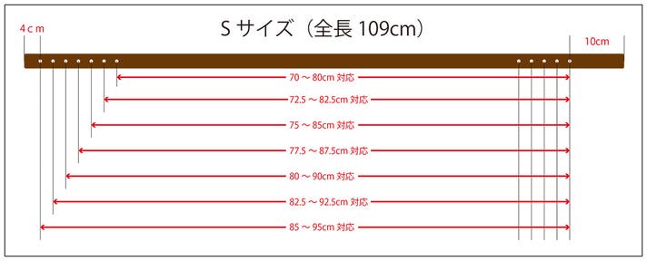 - Sサイズの中央値が82.5cmなので今お使いのベルトより5.5cm小さい