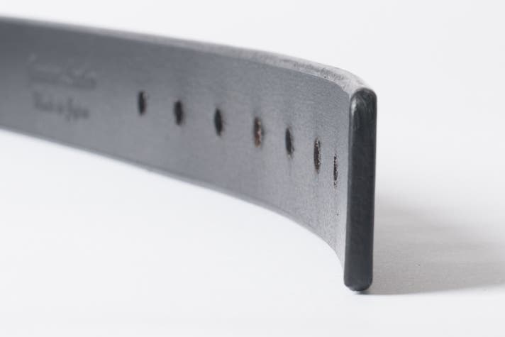 ミニマリストベルトは贅沢に厚みのある一枚革で仕立てており、ベルトの帯が長ければ長いほど作るのが難しい(1頭の牛から取れる量が限られている)のが現状です。