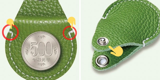 ②右:スナップホック付きで、コインが落ちないようにしています。