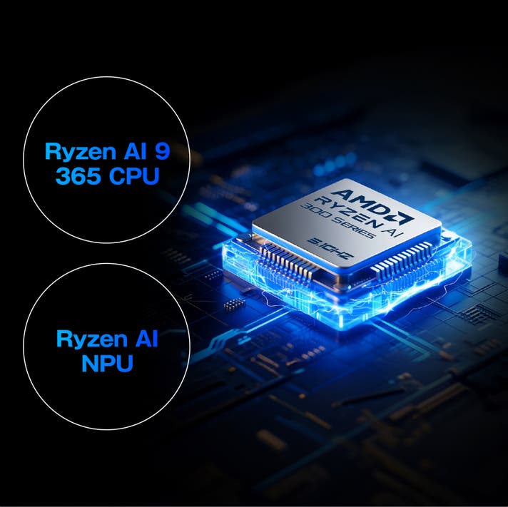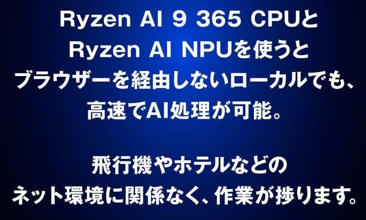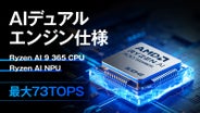本製品の心臓部には、AMD Ryzen™ AI 9 365 プロセッサとRadeon™ RDNA 3.5 GPUを搭載。さらに、生成AI時代を見据えたXDNA NPUを内蔵することで、Stable Diffusionをはじめとする生成系AIワークフローを、ローカル環境で快適に実行できる性能を実現しました。