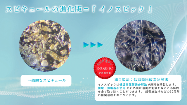 - 韓国の低温高圧酵素分解法にて抽出した従来のスピキュールとは一線を画す「イノスピック」
