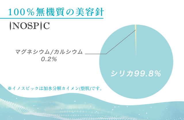 イノスピックの成分は99.8%がシリカ、残りの0.2%がマグネシウムとカルシウムで無機物の天然針です。無機物の針は肌に吸収されることなく、自身の役目を終えると自然と体外へ排出されますので、肌に負担なく優しい成分となっています。