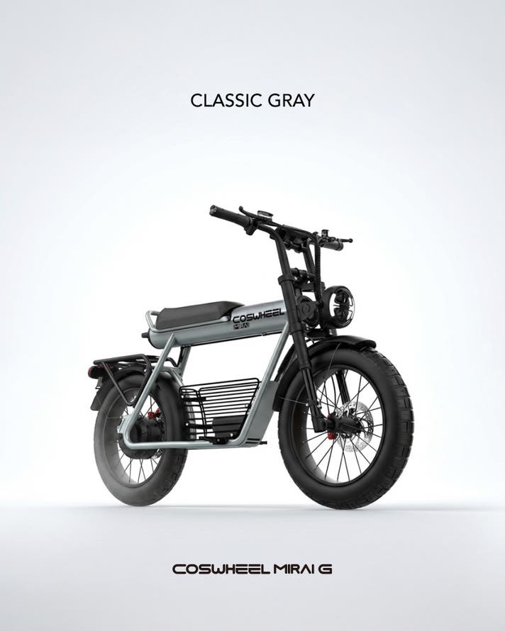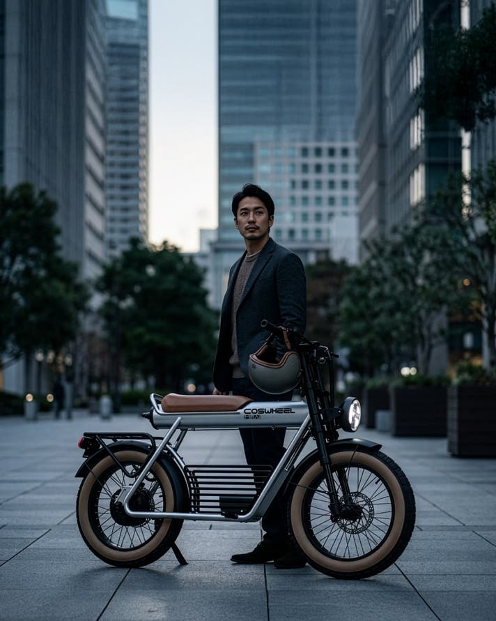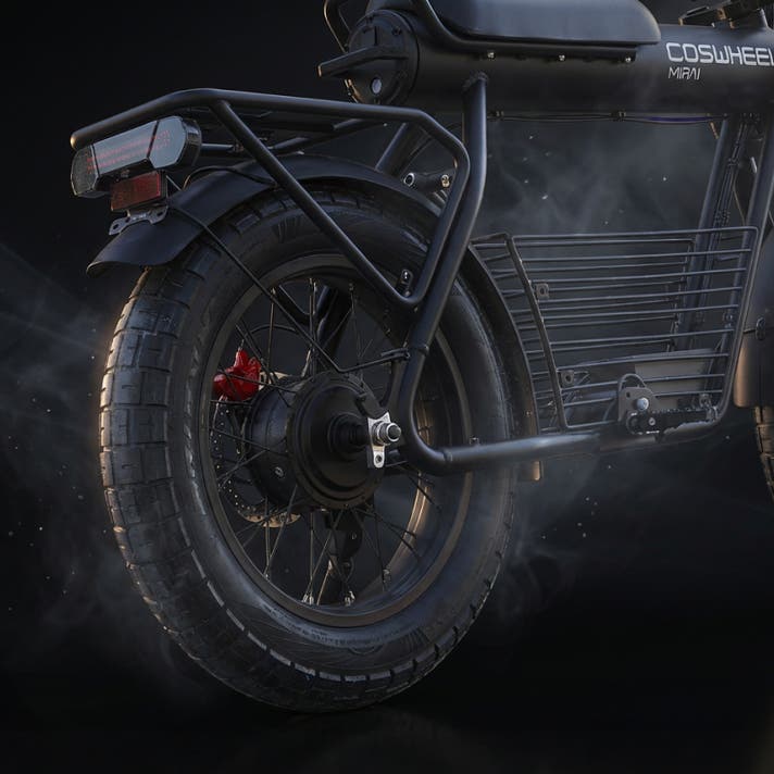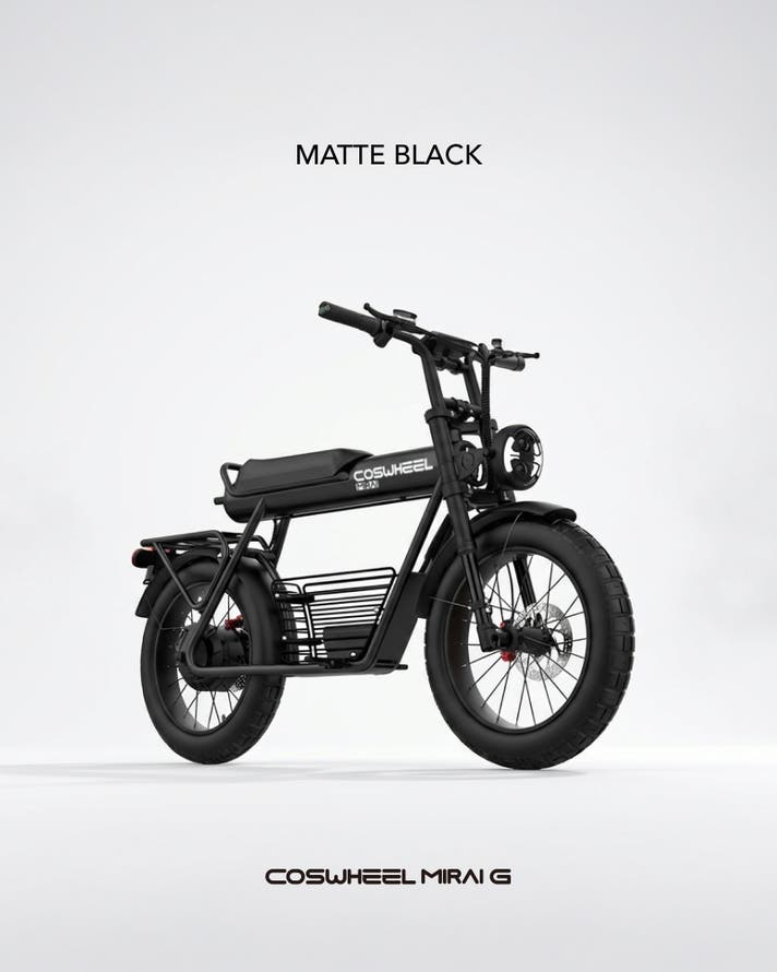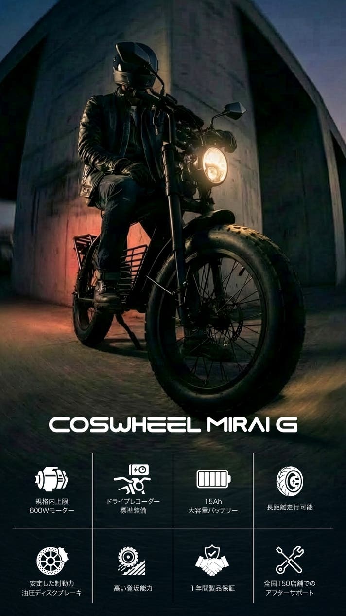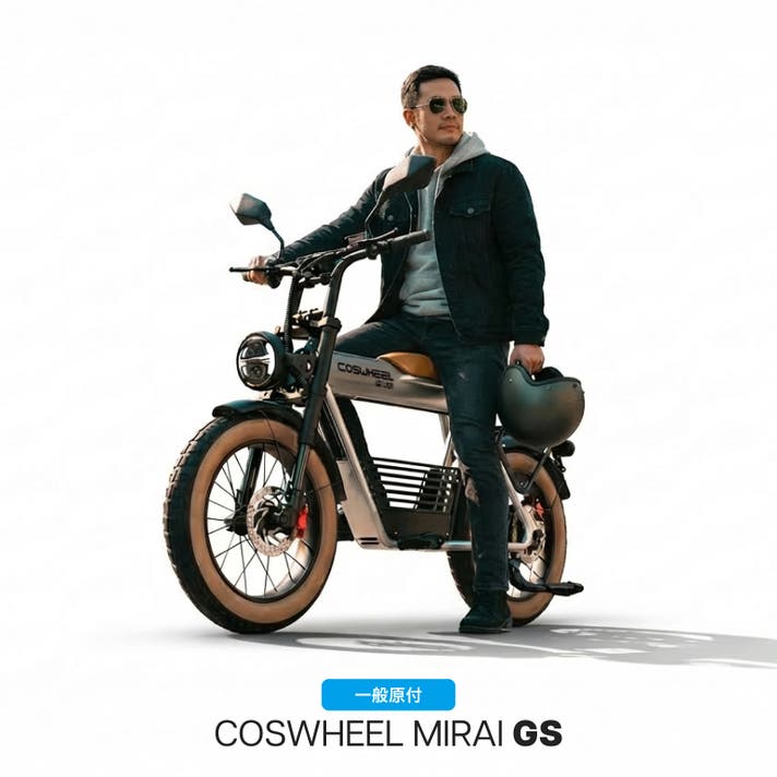 COSWHEEL MIRAI Gシリーズは、街中でひと目を引く骨太フレームと、力強く主張する4インチの極太タイヤを備えた、圧倒的な存在感を放つ電動バイク。