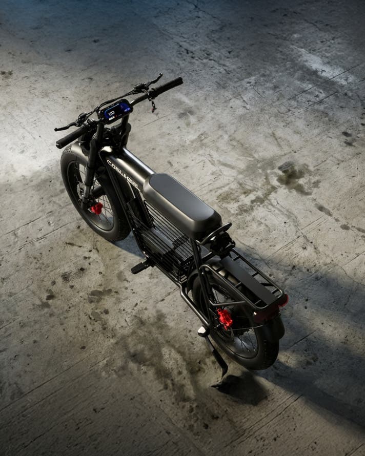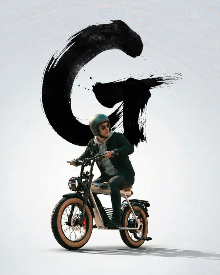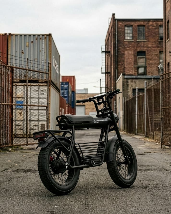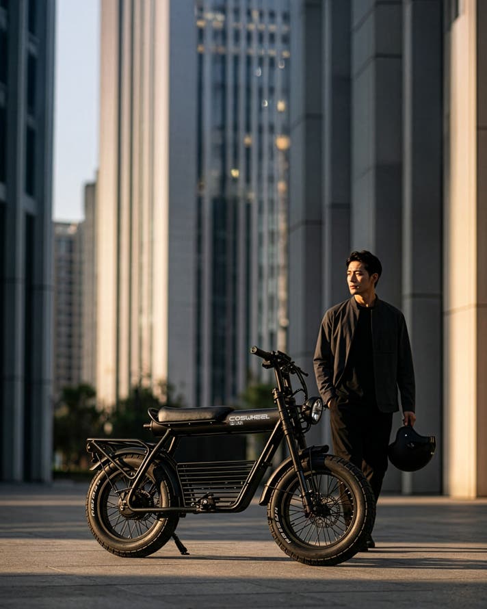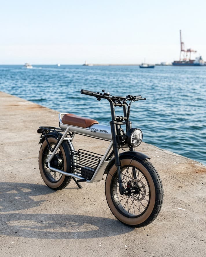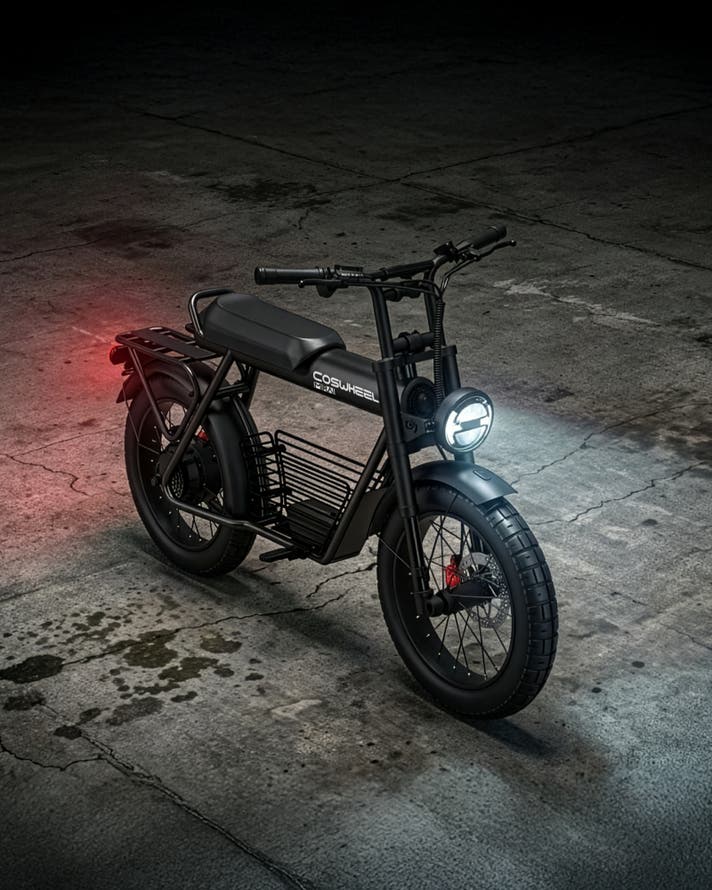 COSWHEEL MIRAI Gシリーズは、街中でひと目を引く骨太フレームと、力強く主張する4インチの極太タイヤを備えた、圧倒的な存在感を放つ電動バイク。