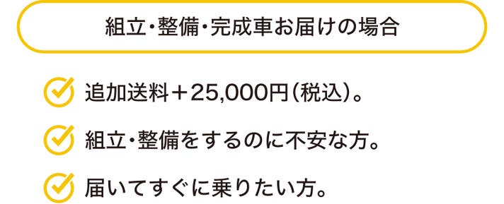 100%組立・整備済みでの配送希望の場合、こちらのオプションを本体とあわせてご購入ください。