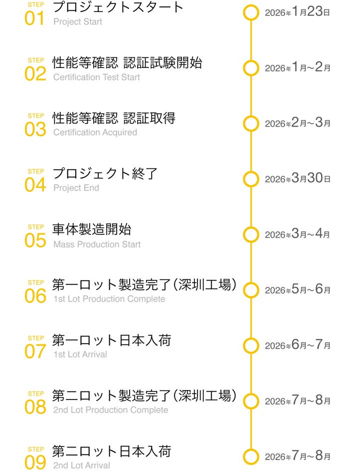 応援購入サービスの性質上、下記の注意点につきましてあらかじめご理解とご了承いただいた上で応援購入くださいますよう、よろしくお願い申し上げます。プロジェクトページに掲載している内容に変更が生じる場合は、速やかに活動レポートにて情報の共有をさせていただきます。 ・ページ内の画像および動画は開発中の車両です。デザイン・仕様が一部変更になる可能性もございます。 ・ページ内の数値に関してはあくまでも試験環境下での結果であり、全ての状況で同様の性能を保証するものではございません。 ■リターンの発送にあたりサポーターに次の協力お願い申し上げます。 以下3点をご提出いただいてからリターンを発送することになりますので予めご了承ください。 ①公的書類を用いた年齢確認(16歳以上であることの確認) 運転免許証等の公的書類の写真画像もしくはスキャンをMakuakeメッセージにてご提出ください。 ②サポーターがナンバープレート・自賠責保険を自ら取得するとともに、その取得が分かる画像・エビデンスの提出。 ③車体受領後にナンバープレートや自賠責保険のステッカーを取り付ける旨の誓約。 【配送遅延とキャンセルについて】 本文中に記載させていただいたスケジュールは、あくまでプロジェクト公開時点の予定です。 応援購入の性質上、製造・輸送状況に加え、性能等確認試験への合格時期によっては、配送が遅延するおそれがございます。 原則として、配送遅延に伴う応援購入のキャンセルはできませんが、リターン配送予定月から3ヶ月を超えた場合には、希望者に限りキャンセルにて対応させていただきます。 【商品等の不具合による返品・交換】 原則として、サポーター都合によるキャンセル・返金は承っておりません。 (サポーター都合のキャンセル不可の例:使用感、誤注文、長期不在) ◾️対応条件:商品の初期不良、またはお届けした商品がご注文内容と異なる場合、到着後14日以内にプロジェクトページの「実行者にメッセージ」よりご連絡ください。状況を確認の上、返金対応、または良品との交換対応をさせていただきます。 ◾️返金額:リターン金額(税込)の全額 ◾️返品送料 / 再送料:実行者負担 【返品・交換をお受けできない商品】 ・製造過程、点検整備中や輸送中に生じる外観上の小傷 ・サポーターの責任により破損、汚損が生じた商品 ・商品のタグ、付属品、パッケージ(箱、袋など)を紛失、破棄された商品 ・事前にご連絡をいただいていない商品 ・商品到着後、15日以上経過した商品 【交換をお受けできないケース】 ・限定品や同一商品の在庫がない場合など、代替品をご用意できない商品 ※一部国内に類似品が出回っている可能性がございます。 弊社では他社の類似品に関してのお問い合わせには対応できませんので、ご了承ください。弊社商品のオリジナル性については、上記プロジェクトに関する情報をご覧ください。