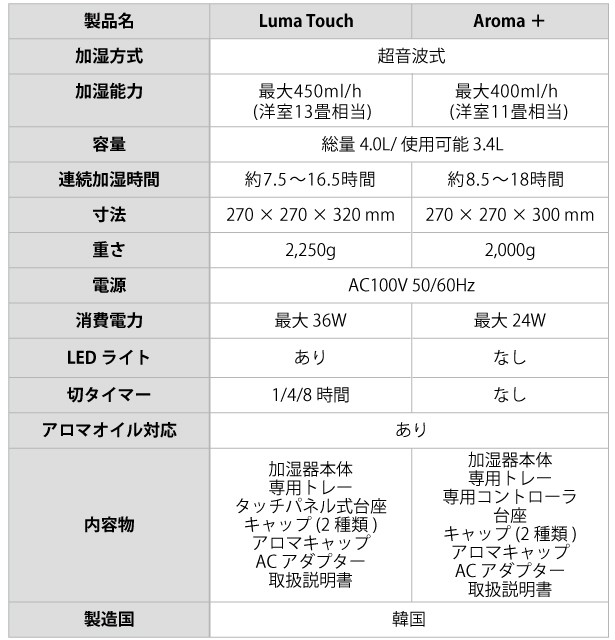 [A]:目安としてLuma Touchは「和室8畳/洋室13畳」相当、Aroma+は「和室7畳/洋室11畳」相当に対応する加湿量となります。これより狭い部屋でご利用される場合は、加湿量を調整されるか、切タイマー等で動作時間を調整しながらご利用ください。