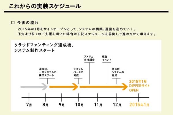 今回、皆様にお願いさせていただきたいのが、情報ポータルサイト「Dipper」の開発資金についてです。 私たちで始めた事業ですが、規模が大きいため、足りない一部の開発・運営資金のご協力をお願い致します。 今後、世界展開も視野に入れながら、開発を進めるにあたり、まずはシステムの構築は絶対条件となります。 今回、皆様にご協力いただき、ぜひともこのシステムの実用化まで進めたいと願っております。
