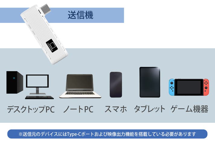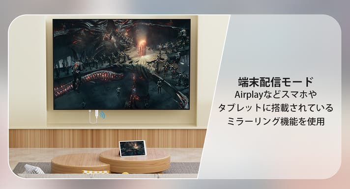 さらに3つめのモードとして端末配信モードを搭載。これは送信機を使わずにお手持ちのスマホやタブレットに搭載されているミラーリング機能を使用してミラーリングできる機能です。