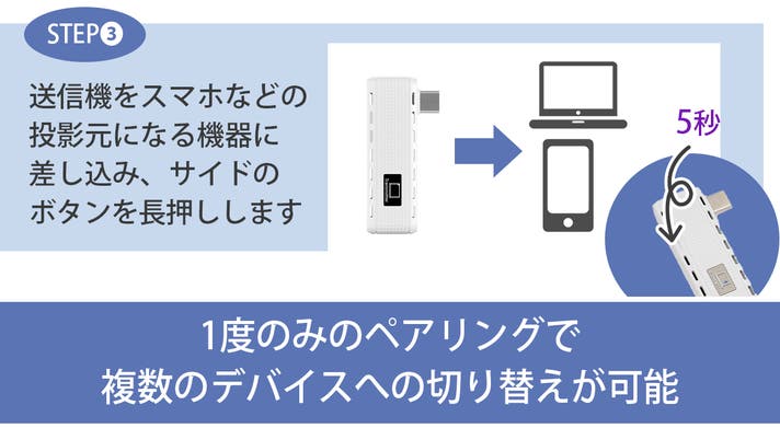 アダプタ本体にあるスイッチを数秒長押しするだけでどの端末からも簡単にミラーリングできます。